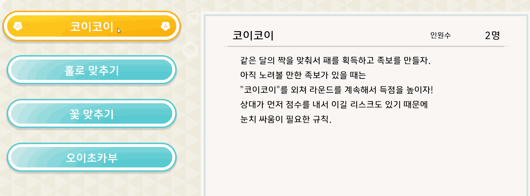 코이코이나 홀로 맞추기와 같은 게임의 간단한 룰을 파악하고