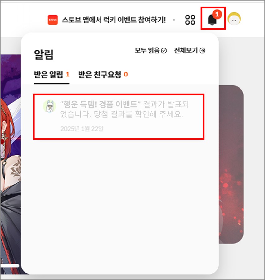 - 당첨 여부는 우측 상단‘알림’ 내 메시지를 클릭하여 확인할 수 있습니다.